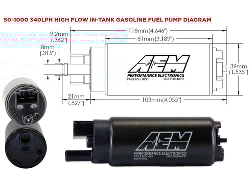 * Power rating given at 40 PSI, 13.5v at the pump terminal with a BSFC of .5. Flow capability for horsepower support is ultimately dependent on fuel hose diameter, and system electrical voltage and amperage capabilities.