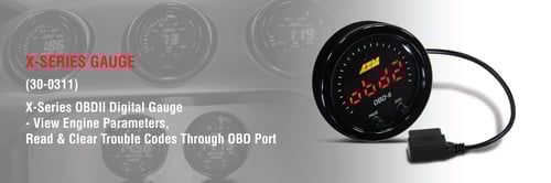 AEM's X-Series OBDII gauge (PN 30-0311) puts multiple channels of data at your fingertips by reading the CAN bus stream of your vehicle's OBD port and transmitting those channels to the gauge display. It reads Diagnostic Trouble Codes (DTCs) and gives you the ability to clear codes. Wiring is as simple as connecting the gauge to your vehicle's OBDII port using the supplied connector! Because the X-Series OBDII gauge reads OBDII parameters transmitted through a vehicle's CAN datastream, it will only work on 2008+ model year vehicles.