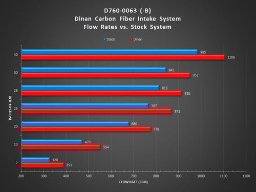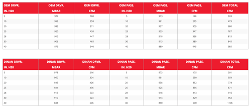 - More Flow: 12.4% increase over stock system (Stock: 815 CFM, Dinan: 916 CFM @ 28" H2O).
